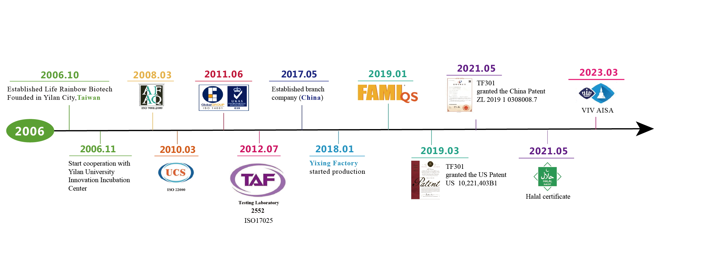 History Established in 2006 by an expert team in microorganism and animal feed production, Life Rainbow Biotech first specialized in mycotoxin solutions. From this position, we were early to recognize the benefit that microorganisms can naturally bring to the livestock industry, and therefore replace the use of antibiotics as growth promoters. We achieve this aim by enhancing animal feed quality through nutrition and scientific innovation, notably microbial-based technologies. Our team is dedicated to assisting animals in reaching their greatest potential while also assisting producers in increasing efficiency, profitability, and sustainability.